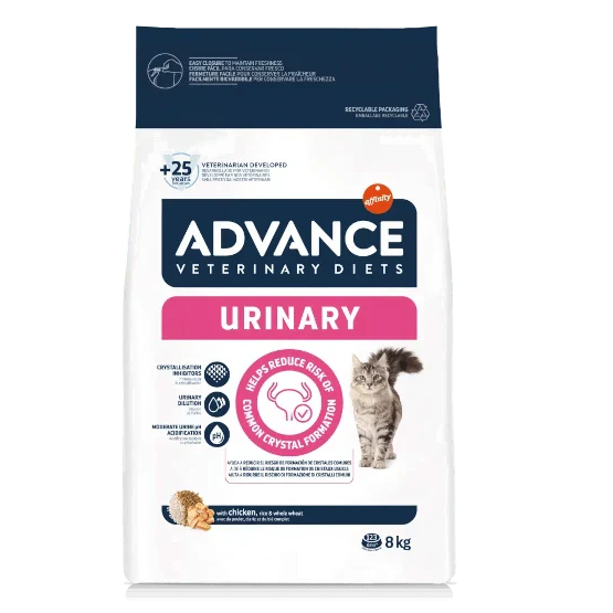 ADVANCE VETERINARY DIETS FELINE URINARY est un aliment diététique complet pour chats adultes, formulé avec des propriétés de sous-saturation de l’urine pour la struvite, des propriétés acidifiantes de l’urine et une faible concentration en magnésium, indiqué aux fins de dissolution des calculs de struvite et de réduction de la formation récidivante de calculs de struvite.