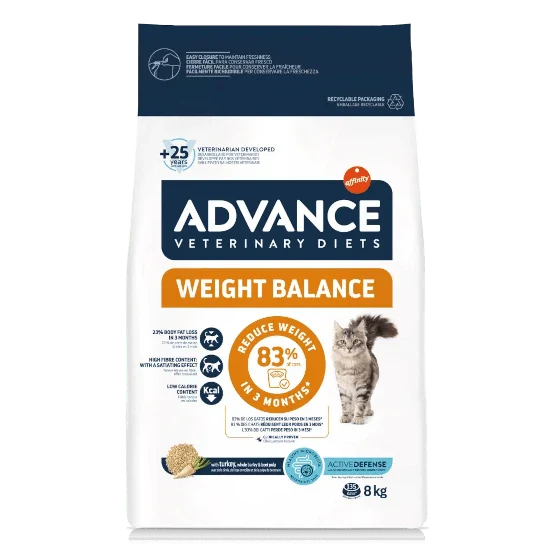ADVANCE VETERINARY DIETS WEIGHT BALANCE FELINE est un aliment diététique complet pour chats adultes, élaboré pour réduire l’excès de poids et réguler le métabolisme lipidique en cas d’hyperlipidémie, grâce à un niveau énergétique faible, une faible teneur en graisse et une teneur élevée en acides gras essentiels. Les résultats d’ADVANCE VETERINARY DIETS WEIGHT BALANCE FELINE ont été cliniquement prouvés, 83 % des chats perdent du poids en 3 mois (étude clinique)