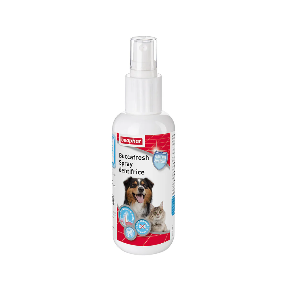 Le Spray dentifrice Buccafresh trois enzymes est parfait pour les chiens qui n’aiment pas la brosse à dents ! Facile et rapide à utiliser, il s’applique sans brossage ni rinçage. Sa formule unique combine trois enzymes qui fixent le calcium, empêchent la plaque et le tartre, et éliminent les bactéries responsables de la mauvaise haleine.