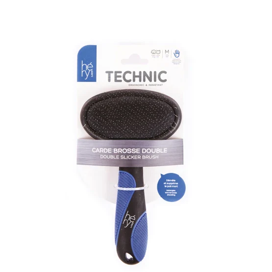 Démêle et supprime les poils morts. La Carde brosse double est spécialement étudiée pour le brossage des sous-poils du pelage. Grâce à ses picots souples et recourbés, vous pourrez brosser en profondeur et démêler les nœuds en douceur. La face nylon permet d’éliminer la pous-sières, les saletés et de lustrer le poil.