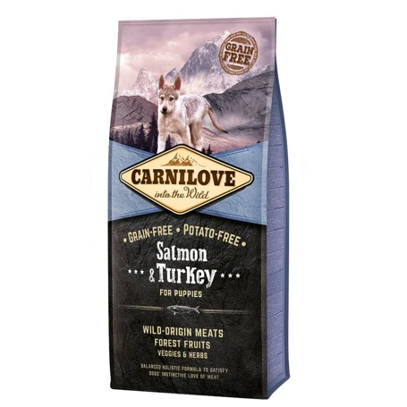Formulé sans céréales ni pommes de terre, Carnilove Chiot Saumon et Dinde répond aux besoins nutritionnels des chiots de 1 à 12 mois, toutes races confondues. Le saumon, source de protéines digestes et d’oméga-3, soutient le développement cérébral, cardiovasculaire et métabolique tout en contribuant à la régulation de la glycémie. Il améliore également la santé de la peau et la qualité du pelage. La dinde apporte des protéines facilement assimilables, du zinc et des vitamines B3, essentielles pour la tonicité musculaire et une croissance équilibrée.