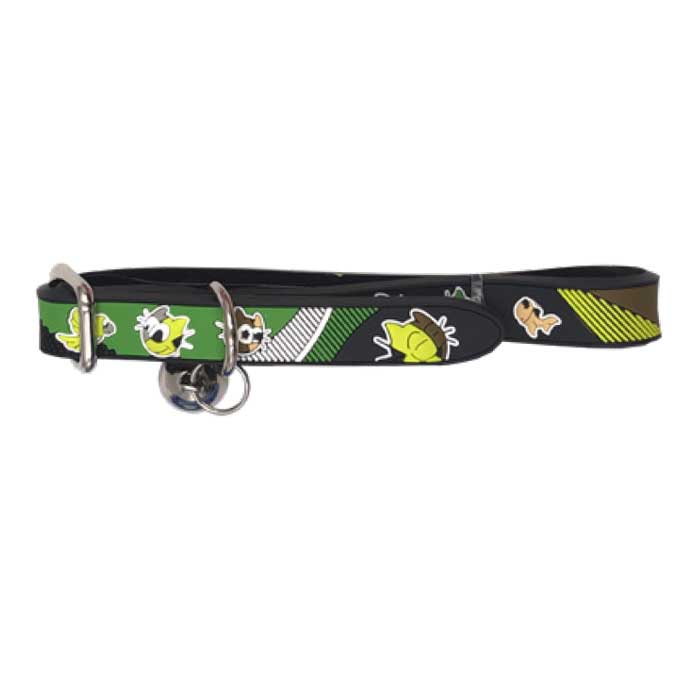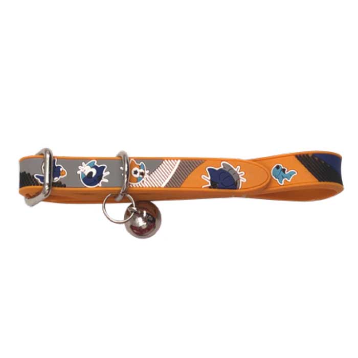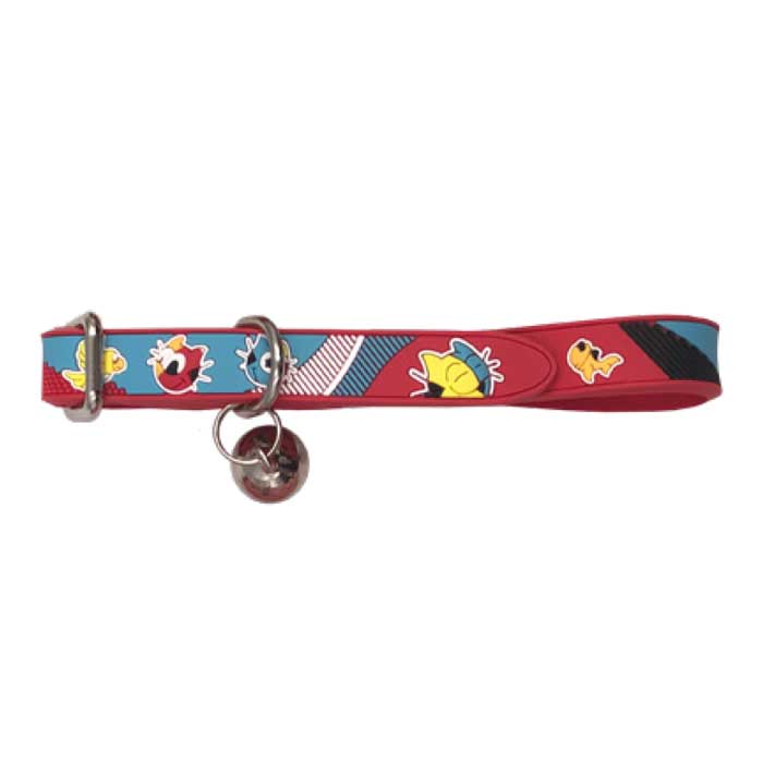 Côté look, le collier est décoré de petits dessins multicolores en léger relief de têtes de chat, d’un oiseau et d’étoiles .