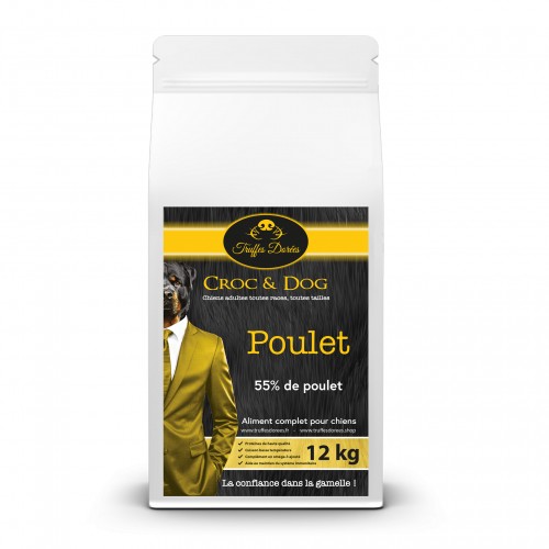 Poulet 55 % (poulet fraîchement préparé 31 %, poulet séché 21 % et bouillon de poulet 3 %), patate douce (26 %), pois (6 %), pulpe de betterave, pomme de terre, graines de lin, complément d’oméga-3, minéraux, vitamines, bouillon de légumes, marjolaine, basilic, origan, sauge, thym, persil, FOS (96 mg/kg), MOS (24 mg/kg)