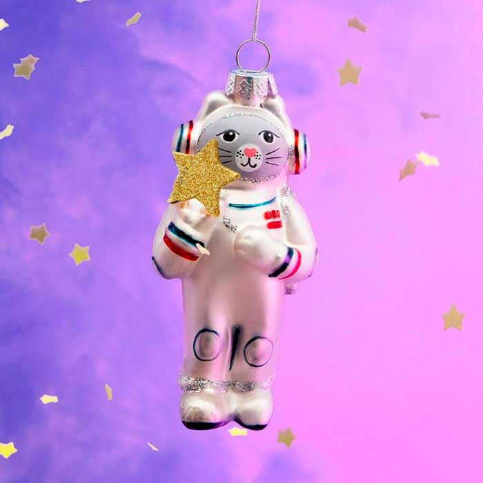 Alors voici donc notre courageux chat astronaute, vêtu de sa combinaison spatiale argentée. Dans une de ses pattes, il brandit une magnifique étoile dorée. Il n’y a plus qu’à l’accrocher dans votre sapin de Noël !