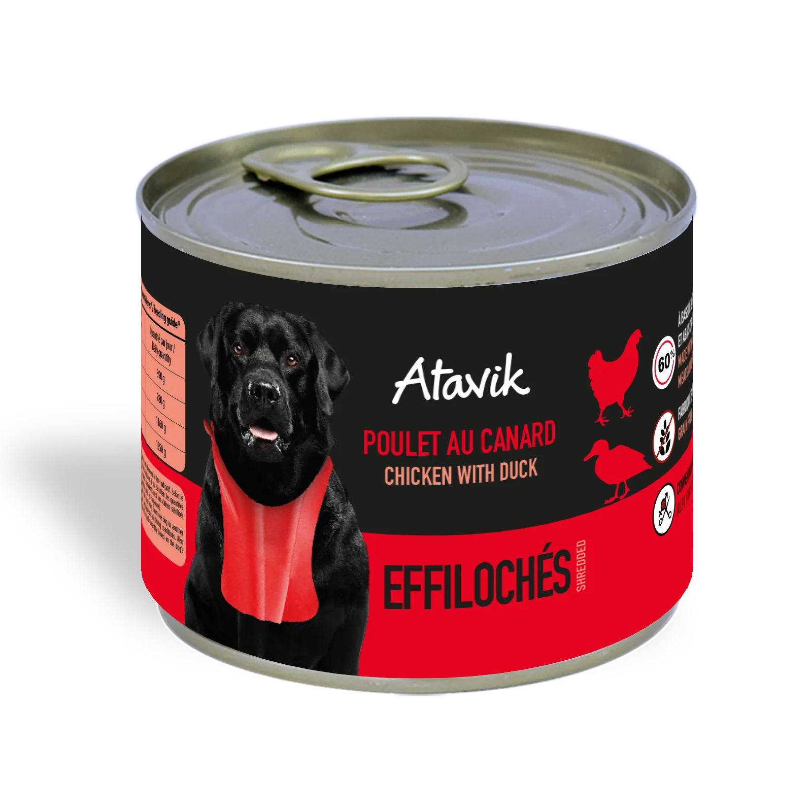 D’une composition courte, simple et claire, notre pâtée pour chien sans céréales l’Effiloché poulet au canard contient 60% d’émincés de viandes et abats frais de poulet et canard. Cette pâtée pour chien sans céréales est fabriquée sans colorants artificiels, sans arômes artificiels et sans conservateurs artificiels.
