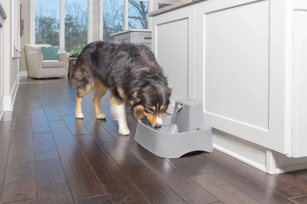 La fontaine pour animaux de compagnie Drinkwell® de 7,5L est spécifiquement conçue pour garantir une hydratation saine et fraîche tout au long de la journée. Cette fontaine automatique comprend un courant d’eau qui coule librement assurant ainsi l’oxygénation de l’eau. Une molette non accessible par l’animal permet de régler le débit du flux d’eau et choisir ainsi un fonctionnement plus ou moins silencieux et rapide. Il est également possible de couper complètement la cascade d’eau, la circulation de l’eau restant assurée par la pompe. La fontaine est équipée d’une double filtration : un premier filtre en mousse capture les poils et la saleté et un second filtre à charbon actif élimine chlore, odeurs et petites particules. La conception de la fontaine a été imaginée pour faciliter son utilisation et son nettoyage. Des poignées incurvées permettent de la déplacer facilement pour le remplissage et ses angles intérieurs arrondis sont faciles d’accès avec une éponge. La fontaine est fabriquée en plastique sans BPA et est démontable pour être lavée au lave-vaisselle.