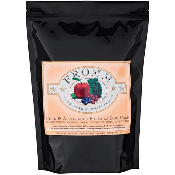 Porc, farine de viande et d’os de porc, gruau d’avoine, orge perlé, foie de porc, riz brun, riz blanc, marc de tomates séchées, graisse de porc, produit d’œuf séché, pois, pommes de terre, pommes, patates douces, huile de saumon, protéines de pois, graines de lin, fromage, carottes, brocoli, sel, phosphate monosodique, chlorure de potassium, racine de chicorée Extrait, vitamines, minéraux, canneberges, extrait de yucca schidigera, sélénite de sodium, acide sorbique (conservateur), myrtilles, taurine, probiotiques.