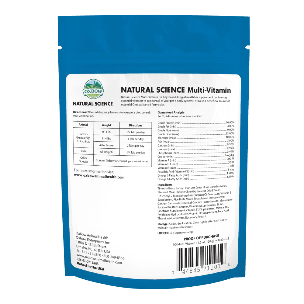 Haut en fibre, soutien quotidien pour votre meilleur ami! Natural Science Multi-Vitamin est un supplément à base de foin, riche en fibres et contenant des vitamines essentielles pour soutenir tous les systèmes corporels de votre animal. C’est aussi une source bénéfique d’acides gras essentiels Oméga 3 et 6.