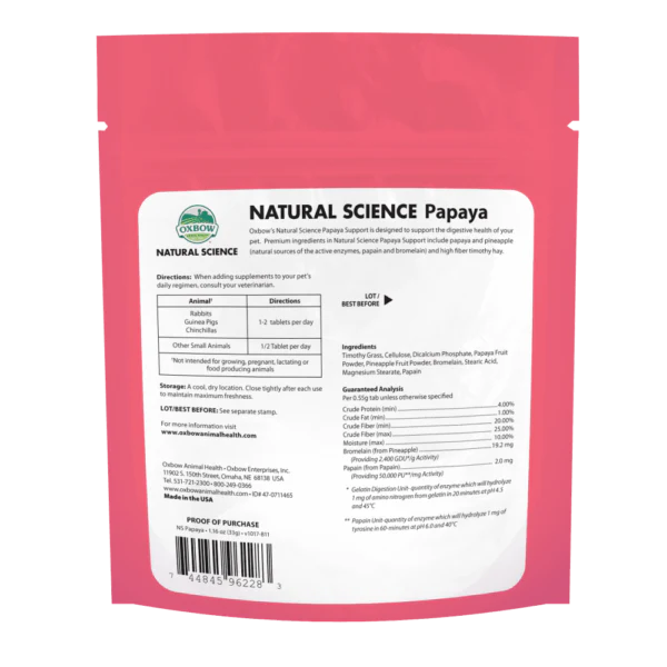 Le Support de papaye d’Oxbow est conçu pour soutenir la santé digestive de votre animal. Les ingrédients de première qualité comprennent la papaye et l’ananas (sources naturelles des enzymes actives, de la papaïne et de la bromélaïne) et le foin de thymus riche en fibres.