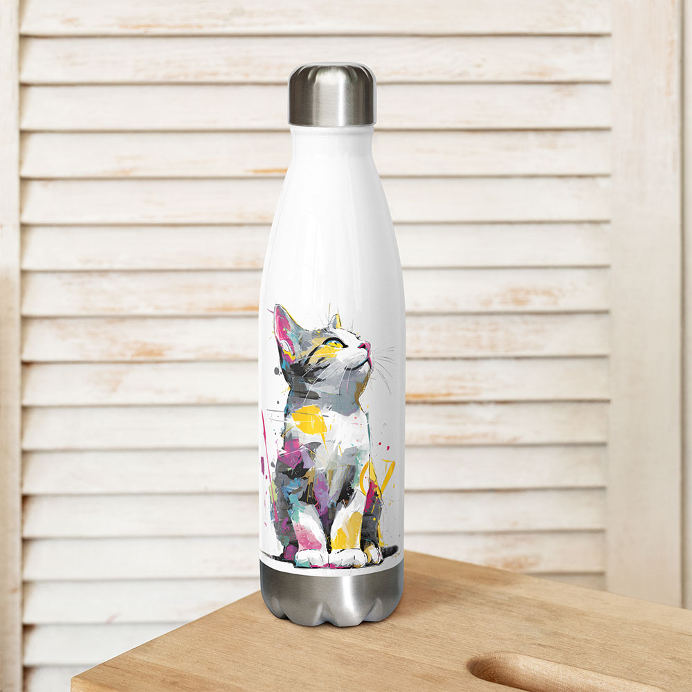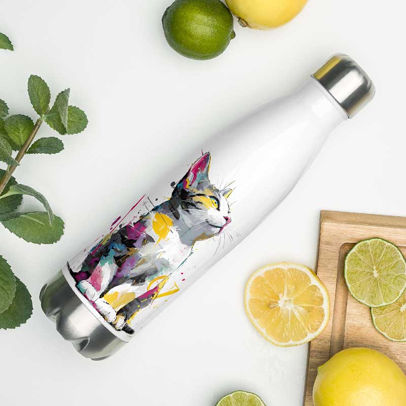 Avec ses touches de couleur jaune, rose et bleue, ce chaton semble tout droit sorti d’une fresque murale moderne. Il apportera une touche de gaieté à votre sac, votre bureau ou vos aventures quotidiennes. Que vous soyez amateur d’art urbain ou simple amoureux des félins, cette gourde saura vous accompagner avec style.