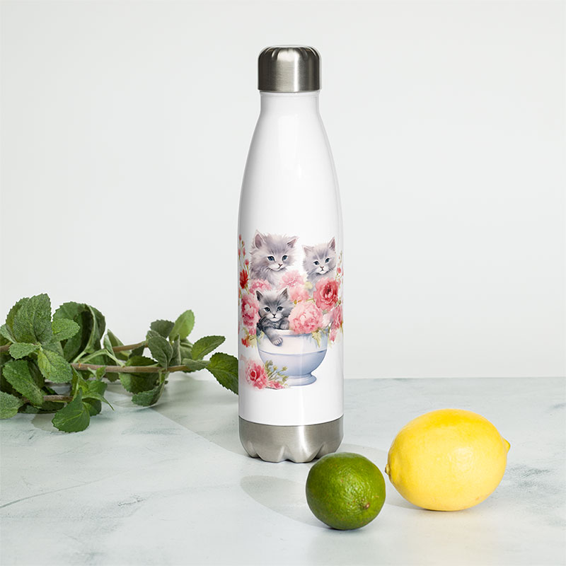 Gourde isotherme Chatons décorée d’un bouquet de fleurs un peu particulier ! Car des petits diablotins s’y sont faufilés pour nous surprendre.