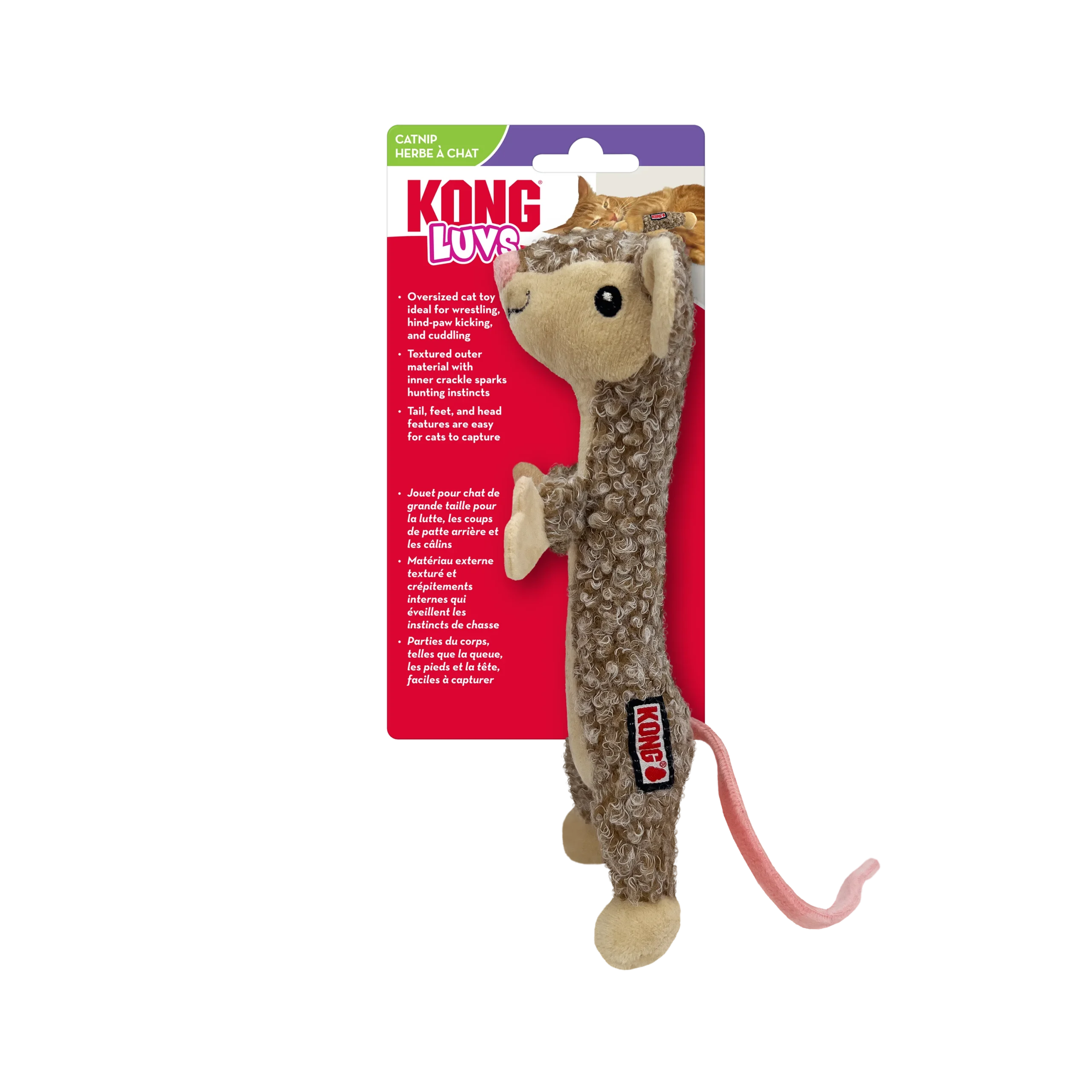 Le KONG Cat Luvs est prêt pour des séances de jeu actif avec votre chat ! Grâce au matériau externe à la texture unique et aux crépitements internes qui incitent à lutter et à donner des coups de patte arrière, ce jouet géant pour chats est parfait pour les sessions de jeu impliquant tout le corps. Les parties du corps de ces jouets faciles à capturer, telles que la tête, les pattes et la queue, en font un adversaire idéal. L’herbe à chats KONG Premium North American Catnip que contient ce jouet invite les chats à revenir sans cesse jouer énergiquement en solo. Lorsque votre chat est fatigué de toute cette agitation, le jouet Luvs devient le copain à dorloter parfait.