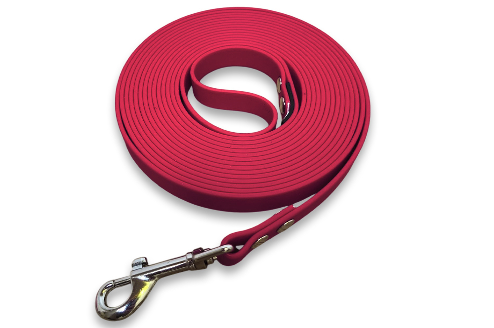 Longe pour chien imperméable et antibactérienne, très utile pour les promenades ou l’éducation. Deux largeurs sont proposées : 10 et 16 mm. La largeur la plus fine est particulièrement adaptée pour les chiots, les petits chiens ou les chats. Si vous choisissez l’option sans poignée, il n’y aura rien au bout de la longe (pas d’anneau, rien pour y attacher une poignée indépendante).