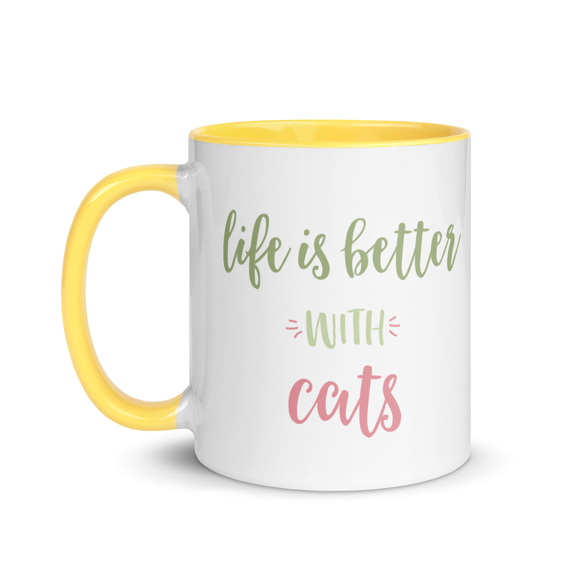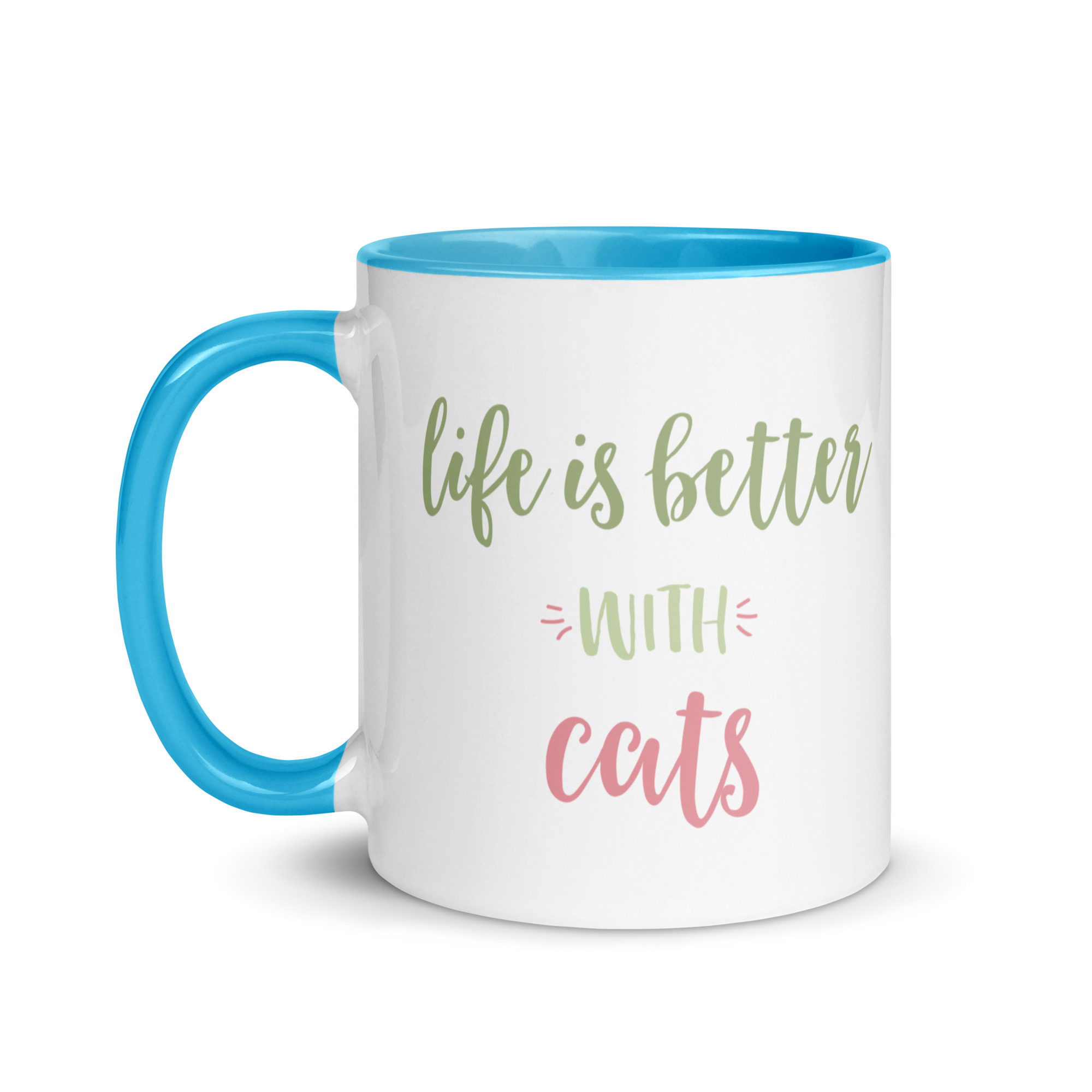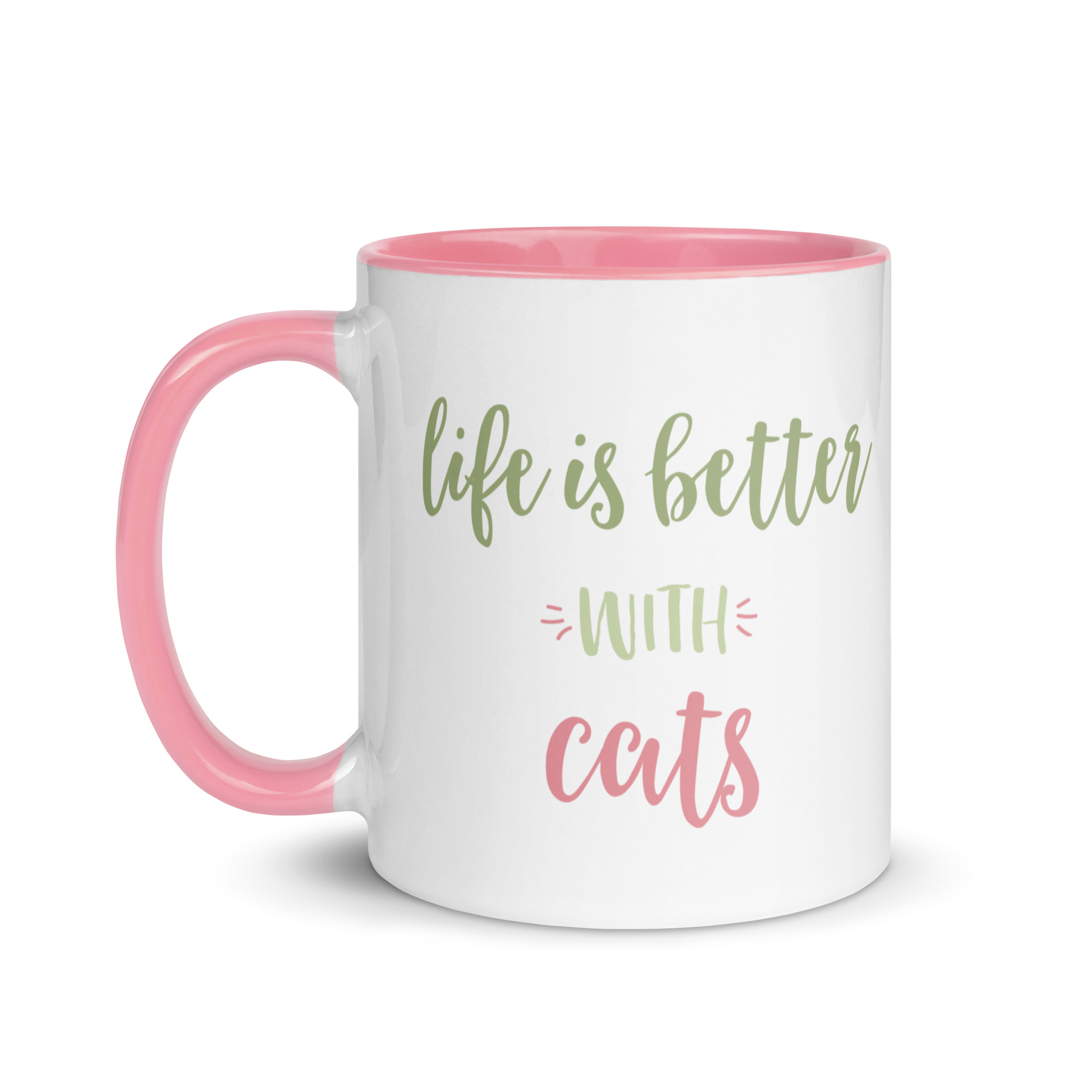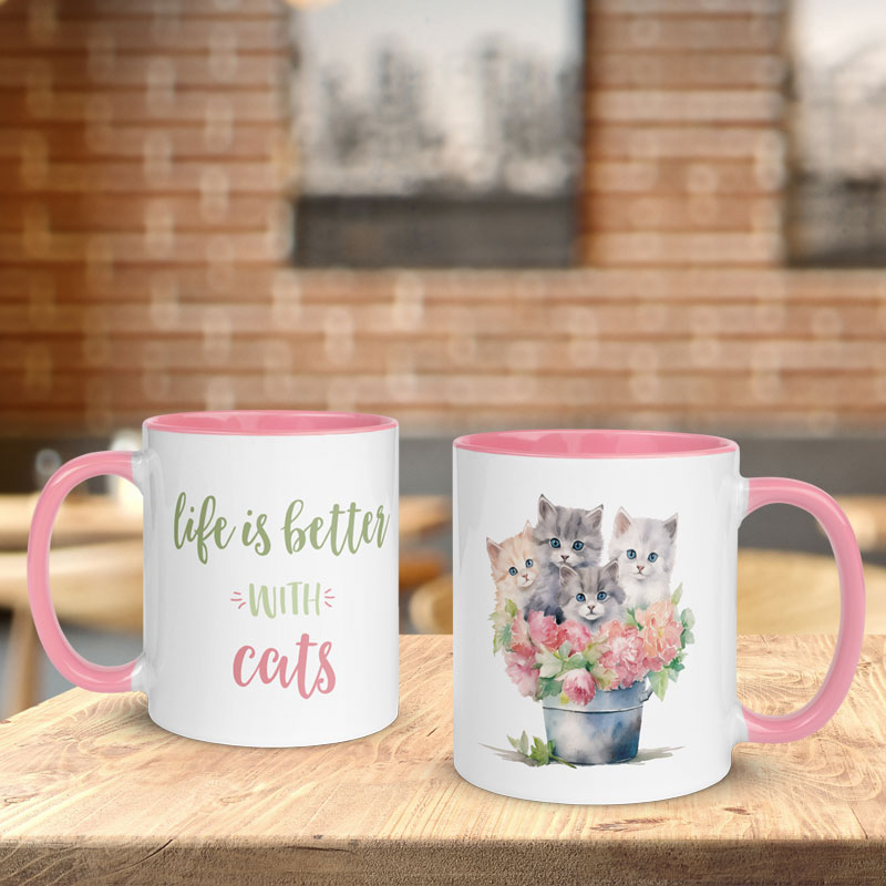 D’autre part, l’illustration a été créée dans un style aquarelle très délicat et des tons pastel. De plus, de l’autre côté du mug, une petite phrase est écrite dans la même palette de couleurs en utilisant des styles de caractères tendances. Life is better with cats (la vie est plus belle avec des chats).