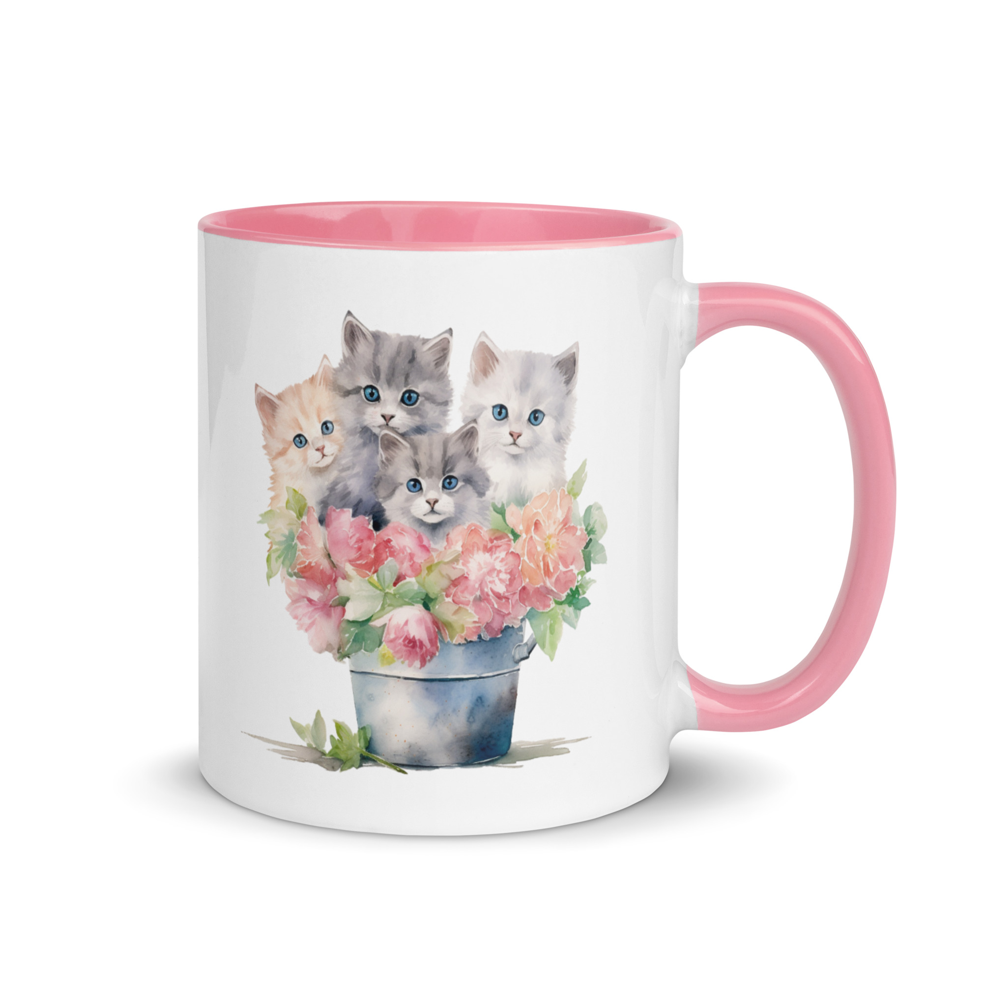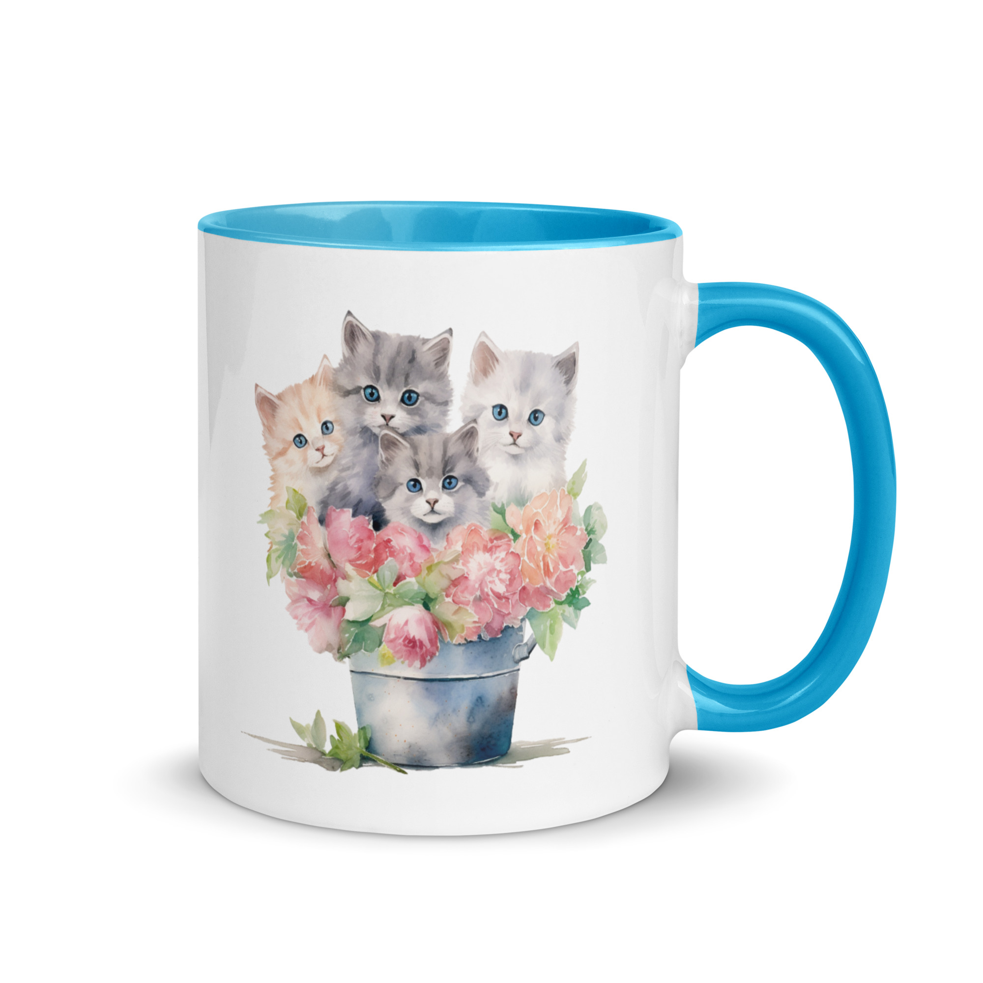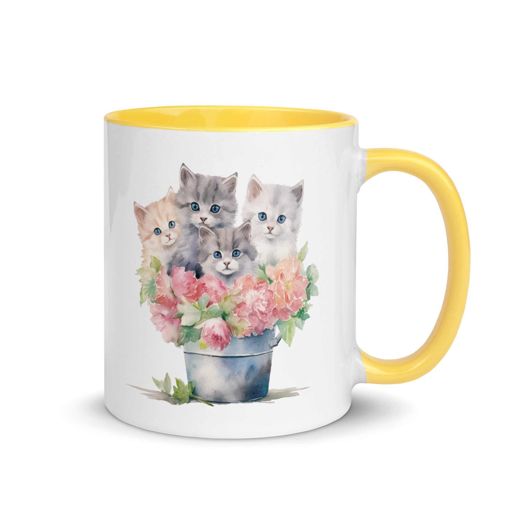 Le mug chatons est disponible en 4 couleurs (intérieur et poignée) : bleu, jaune, rose et rouge.