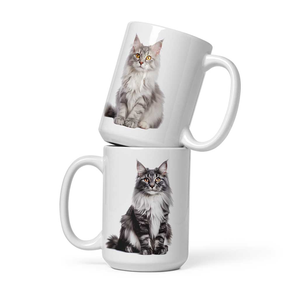 D’un côté du mug, le Maine Coon mâle a un pelage plus sombre. De l’autre côté, la femelle a une teinte de black silver plus claire.