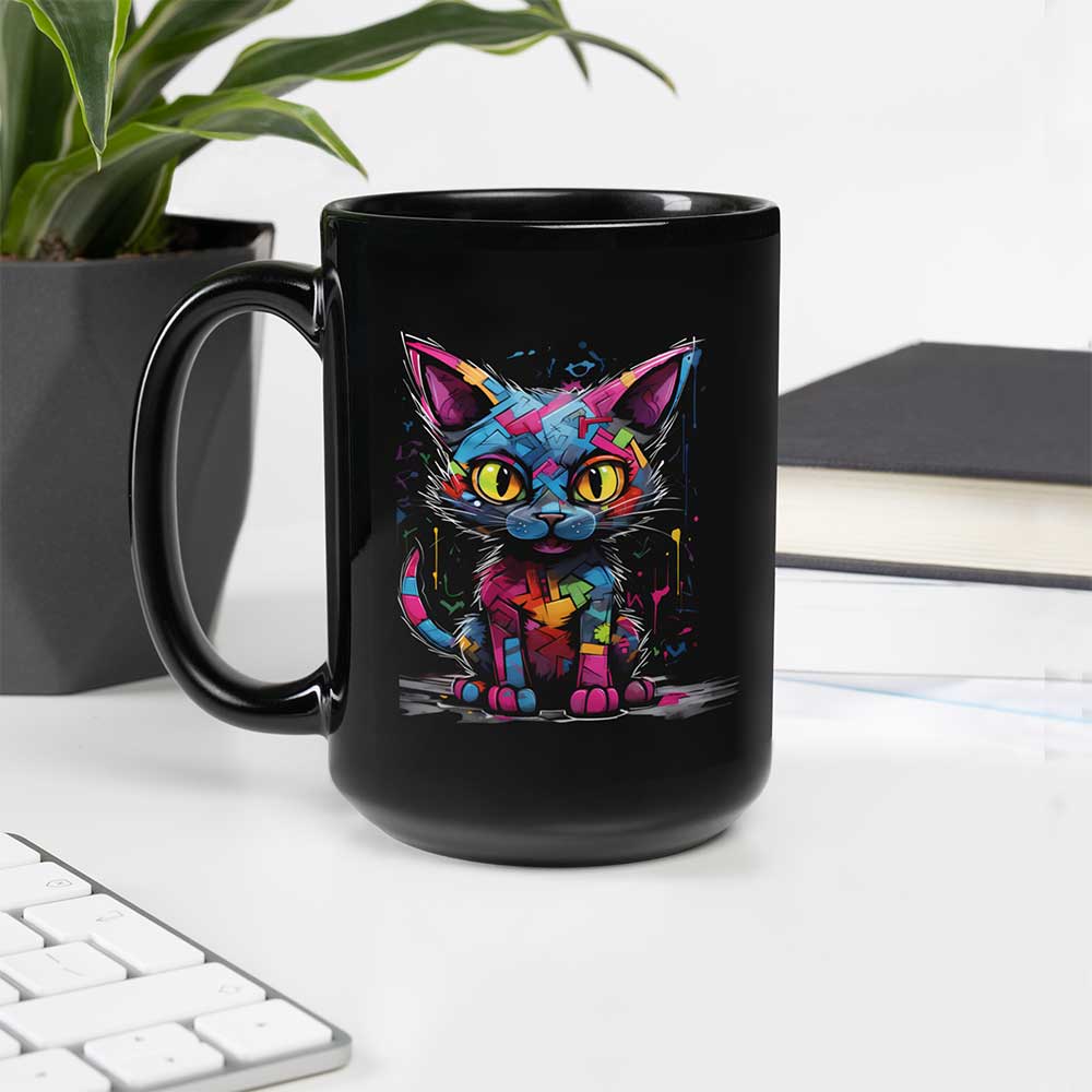 Disponible en taille classique ou XXL, ce mug noir joue sur le contraste avec son illustration de chat aux couleurs flashy. Rose fluo, jaune, bleu, vert et rouge : toutes ces teintes vives sur fond noir brillant donnent beaucoup de caractère et de dynamisme.