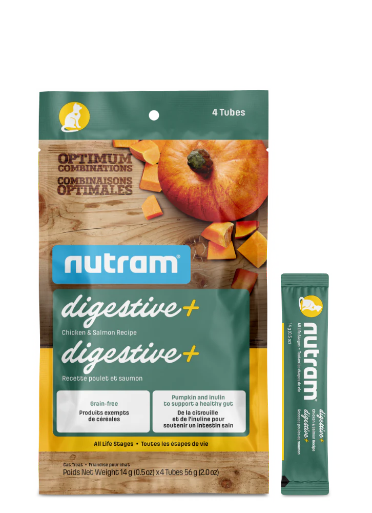 Les gâteries Nutram Digestive+ pour chats sont riches en citrouille, dont ses fibres naturelles facilitent la circulation des aliments dans le système digestif.
