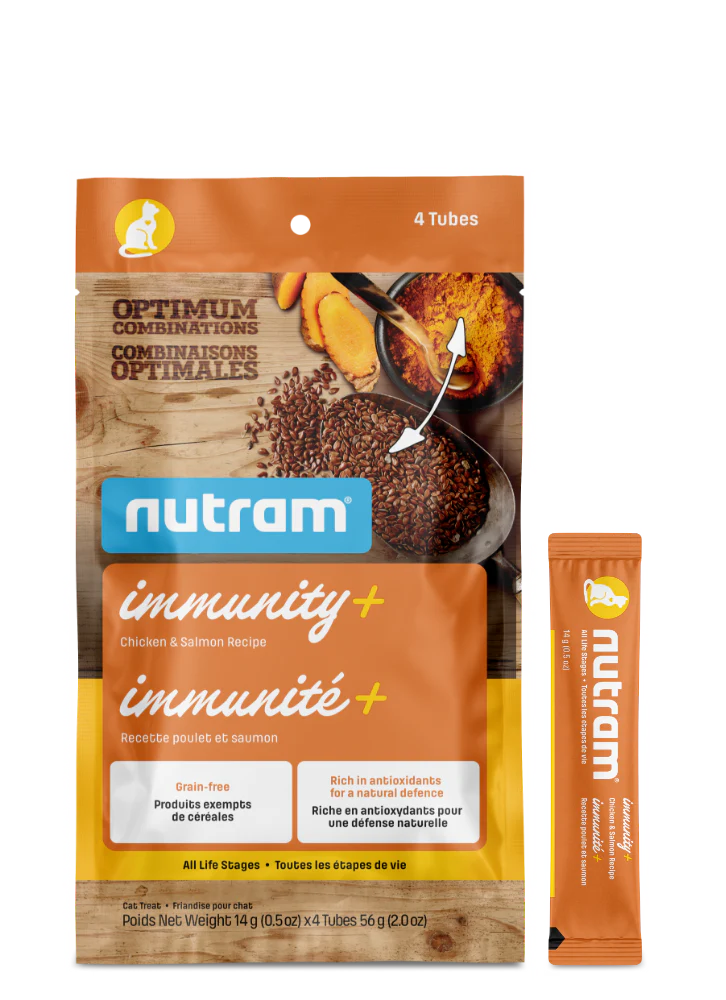 Les gâteries Nutram Immunité+ pour chats soutiennent les défenses naturelles de votre animal de compagnie. Les graines de lin, riches en acides gras oméga-3, et le curcuma, source de curcumine, renforcent le système immunitaire.