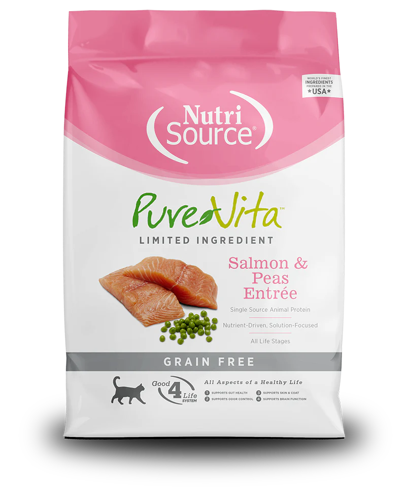 - En tant que membre de notre série d’aliments pour chats sans céréales, la nourriture pour chats NutriSource Pure Vita Entrée de saumon et de pois sans céréales est formulée pour répondre aux directives de l’AAFCO pour toutes les étapes de la vie.