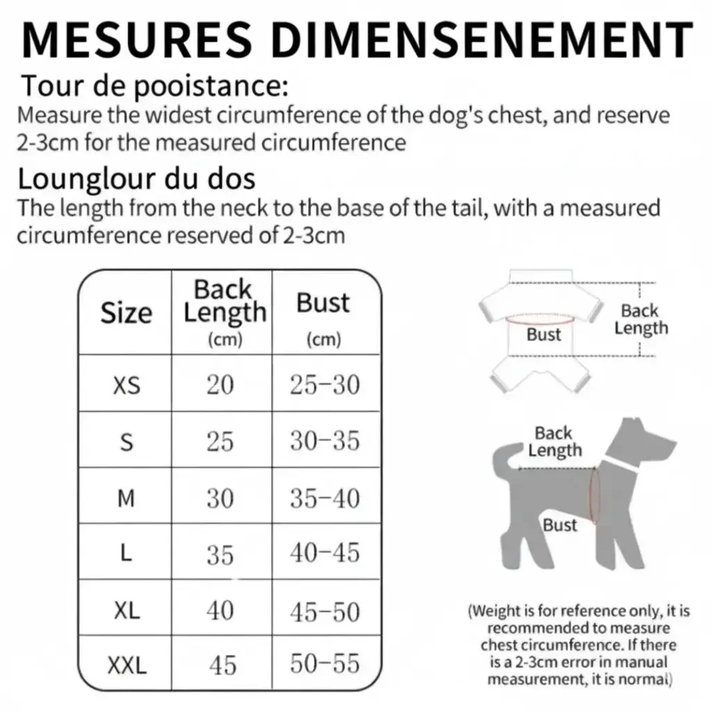 Choisir la bonne taille est essentiel pour garantir confort et efficacité. Mesurez le tour de poitrine de votre chien (la partie la plus large derrière les pattes avant) et la longueur du dos (de la base du cou à la base de la queue). Consultez ensuite notre tableau des tailles pour identifier celle qui convient parfaitement. Entre deux tailles ? Optez toujours pour la plus grande pour assurer le bien-être de votre animal.