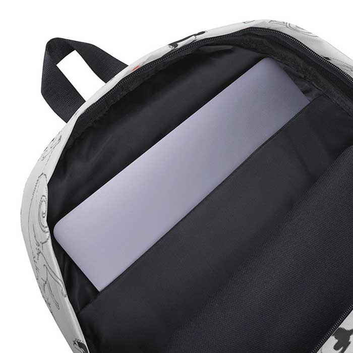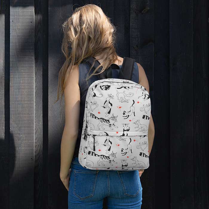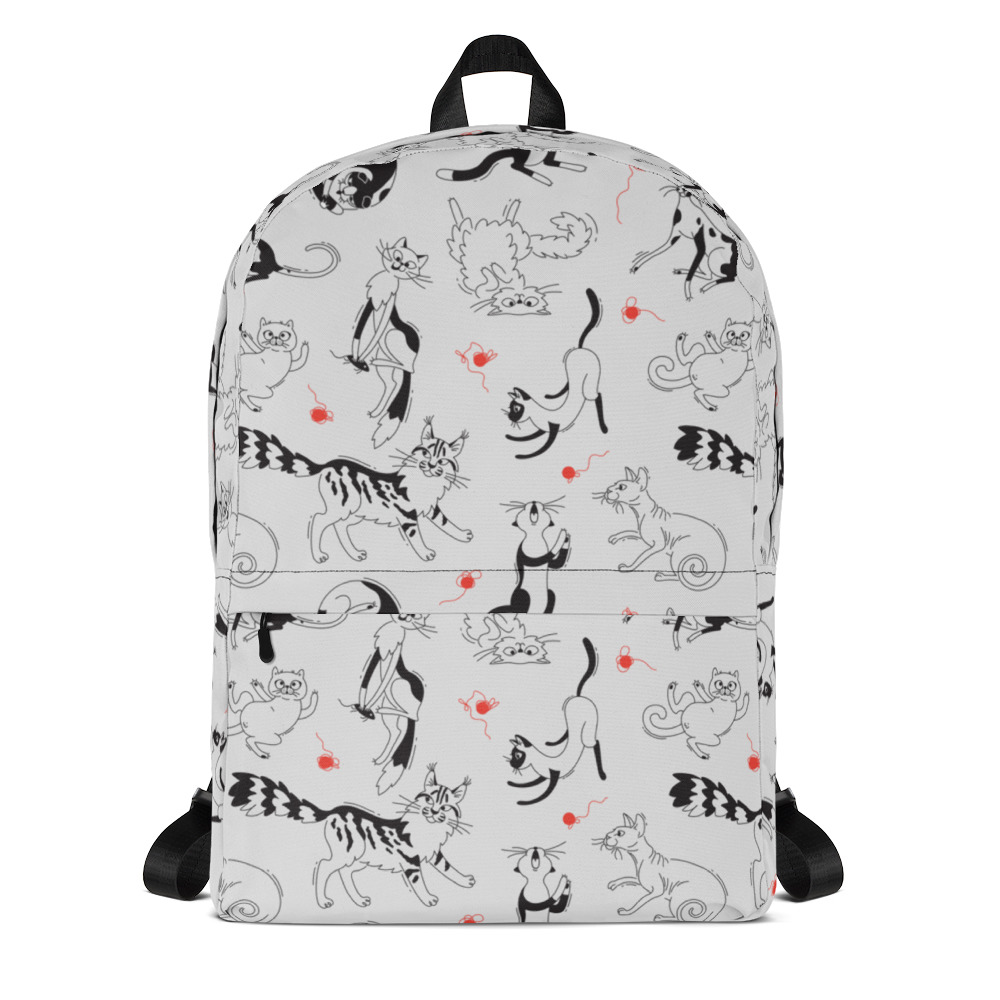 Et puis bien sûr, ce magnifique sac à dos est décoré d’une multitude de chats rigolos sur fond gris clair. Des petites pelotes de laine rouges ajoutent une touche de peps au décor.