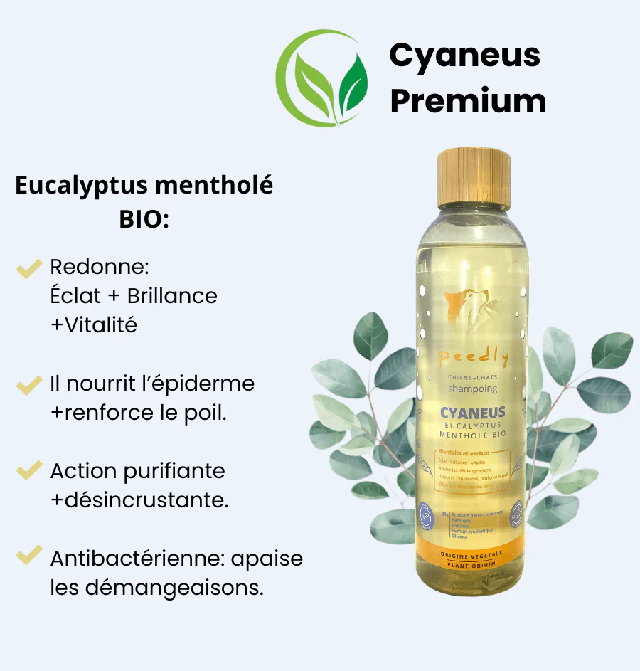 Cyaneus, c’est le shampoing purifiant par excellence : 99,9 % naturel et bio, formulé pour les chiens sujets aux odeurs tenaces, aux pelages gras, ou aux peaux à tendance kératinisée.
