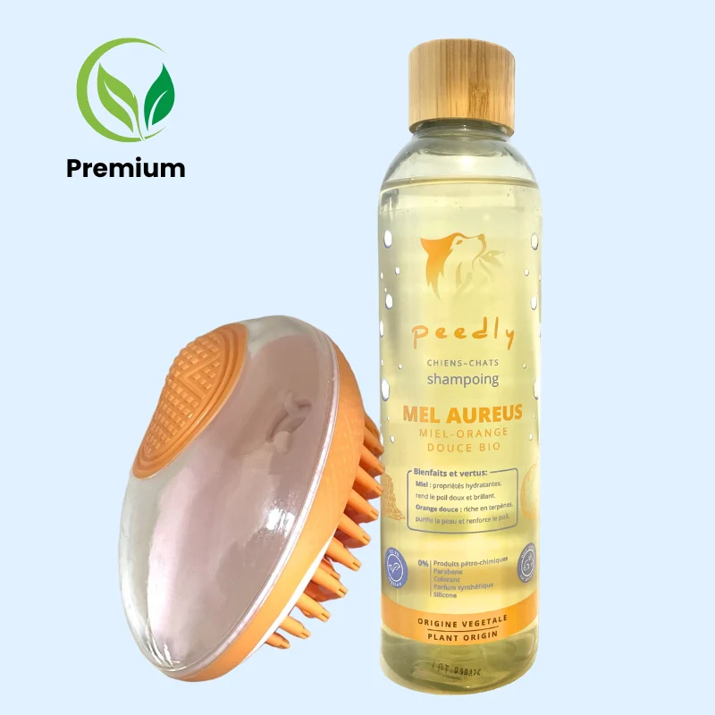 Offrez à votre compagnon un soin de qualité supérieure grâce à cette combinaison exclusive : le shampoing Mel-Aureus 250 mL (99,9 % naturel & bio) + une brosse de bain 2-en-1 innovante.