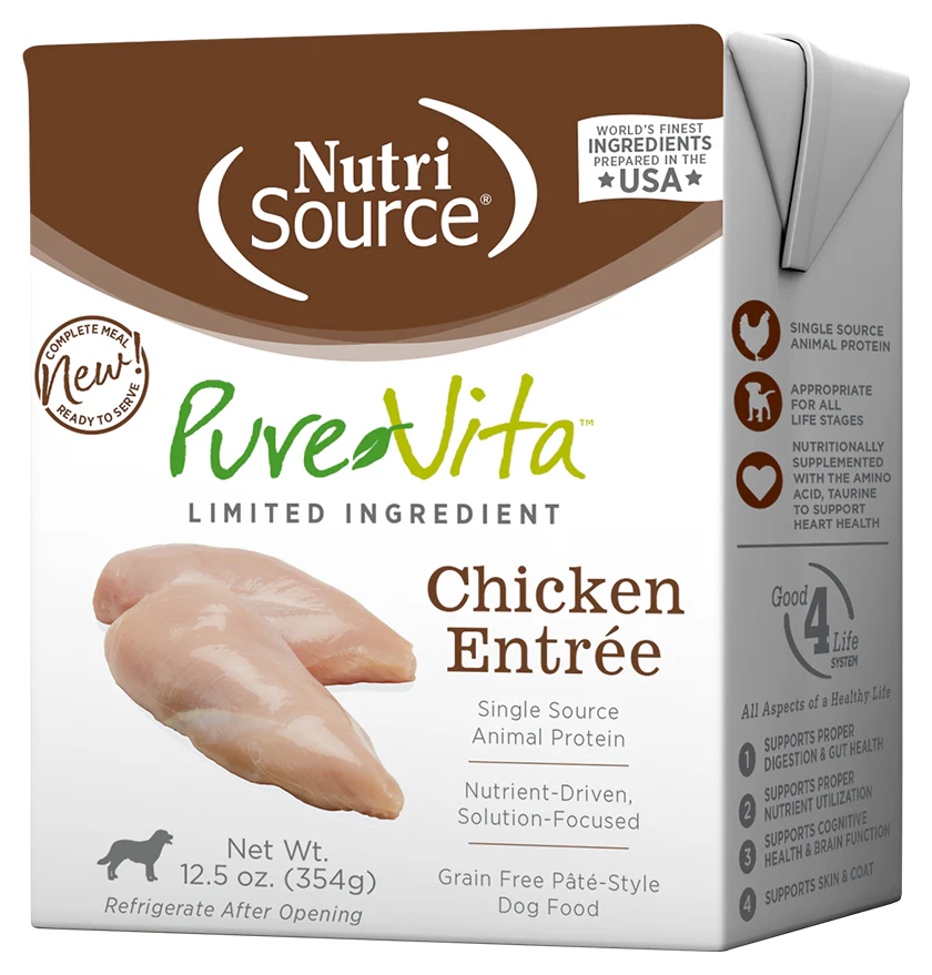 -La nourriture pour chiens NutriSource PureVita Pate-Style comprend des recettes riches en protéines animales riches en viande et à source unique.