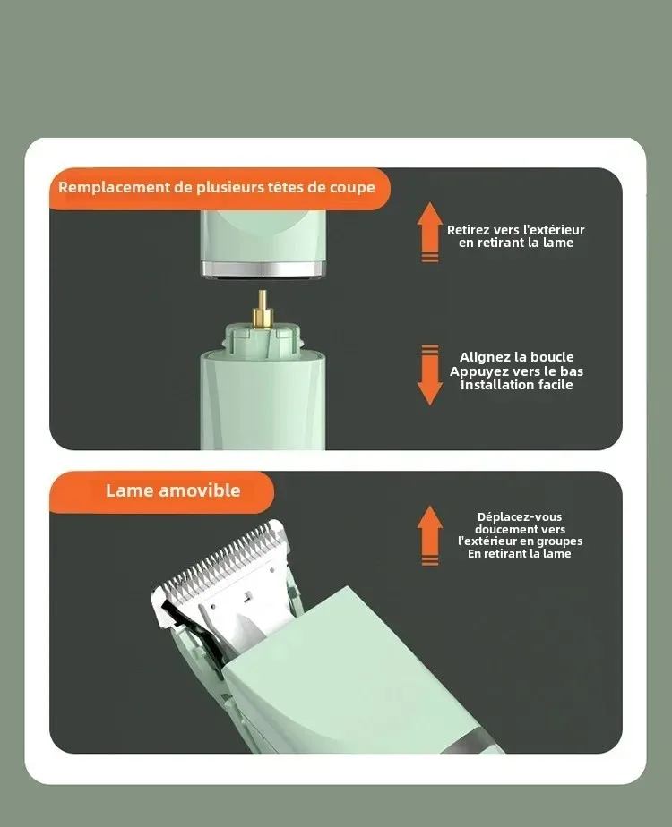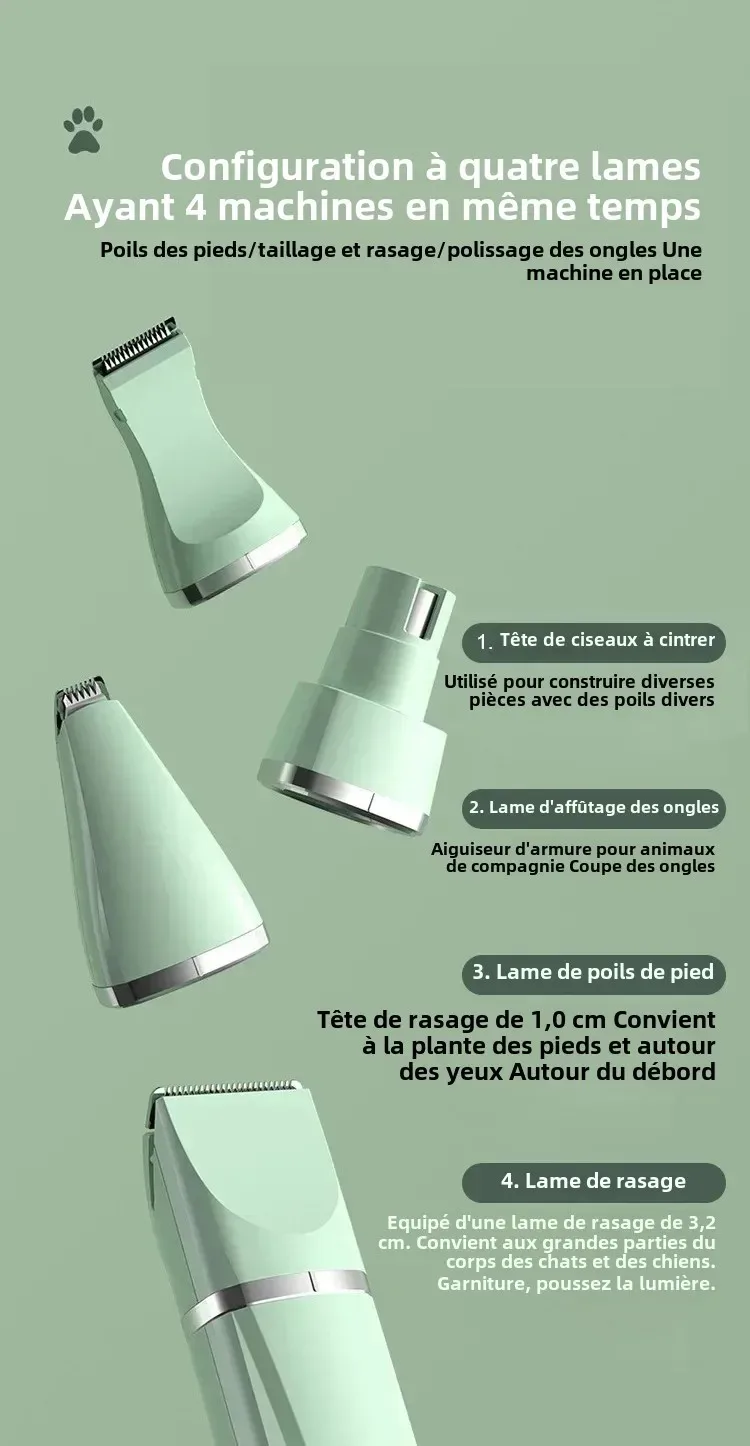 • 4 en 1 : têtes de coupe polyvalentes pour différentes zones (corps, visage, pattes, oreilles).
